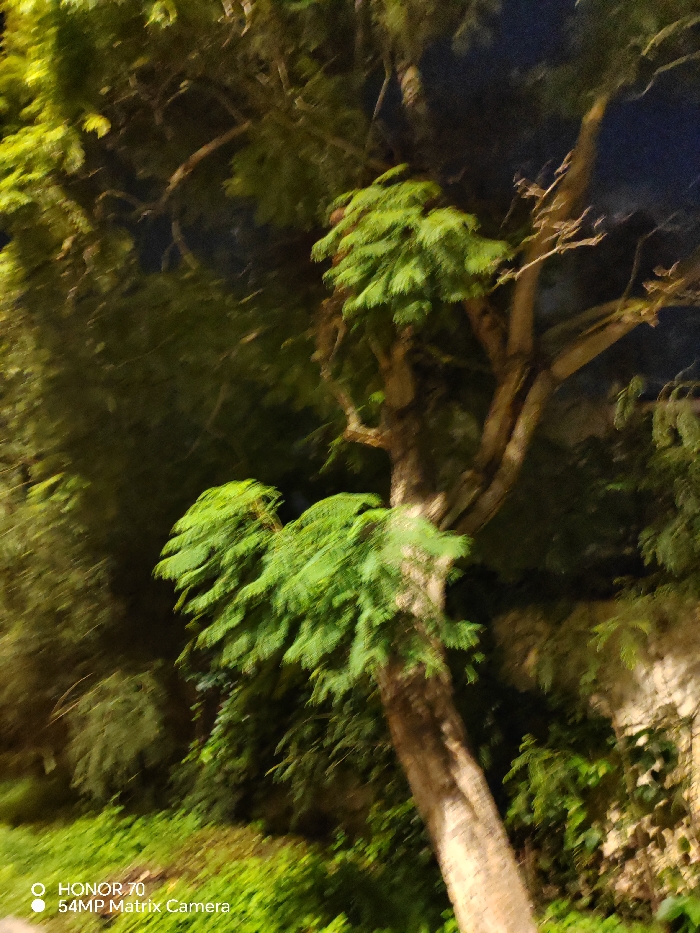 A tree dominates the frame, its thick trunk stretching upwards. Lush, vibrant green foliage clusters on its branches, contrasting with the darker, indistinct background. The image, captured at night, has a soft, blurry quality. Ground-level vegetation adds a layer of green at the base. The phrase "HONOR 70 54MP Matrix Camera" is visible in the bottom left corner.