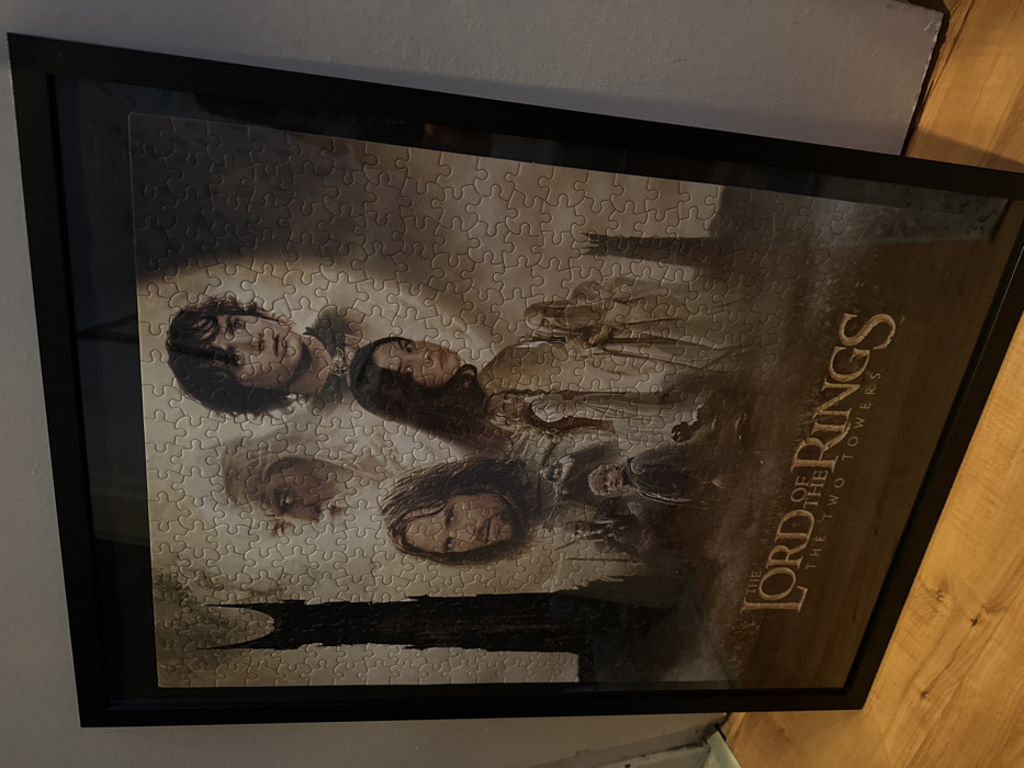 - "The image displays a framed jigsaw puzzle depicting the movie poster for "The Lord of the Rings: The Two Towers" by FM-40rHI3, licensed under CC BY 4.0