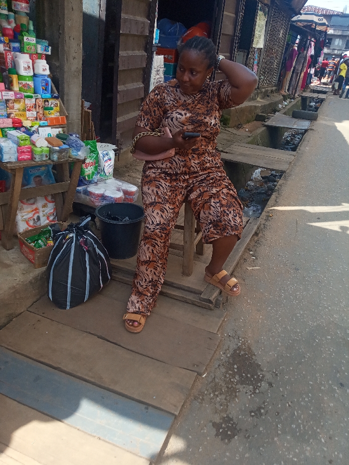 The image depicts an outdoor commercial scene in Nkwelle, Nigeria. In the foreground, an adult female is seated on a wooden stool, facing slightly left. She wears a brown and black animal-print short-sleeved jumpsuit and tan platform sandals. A pink shoulder bag with a gold chain strap is visible on her left side. She holds a dark-colored smartphone in both hands, looking down at the screen, with her right hand simultaneously near the back of her head, possibly adjusting her hair. To her left, a makeshift market stall is set up against a wooden-plank building facade. The stall displays various packaged consumer goods on a wooden table, including soaps, lotions, detergents, and baby products. Below the table, a box of green-packaged items and a white bag of bulk goods are present. A black plastic bucket and a large black trash bag with white stripes sit on the ground near the stall. The area immediately in front of the stall and where the woman is seated consists of wooden planks spanning an open concrete gutter. The gutter, filled with dark water and debris, runs parallel to the building. Beyond the gutter, an asphalt road extends into the background, where distant figures, additional market stalls, and structures are visible under daylight conditions.