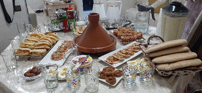 A table is laden with a variety of foods, including dates, filled pastries, mini pizzas, hard-boiled eggs, and long bread rolls in a basket. A brown tagine sits centrally, surrounded by small cakes and condiments like ketchup. Several drinking glasses and beverage containers, including a blender filled with a pale drink, are also present on the table, suggesting a gathering or feast.