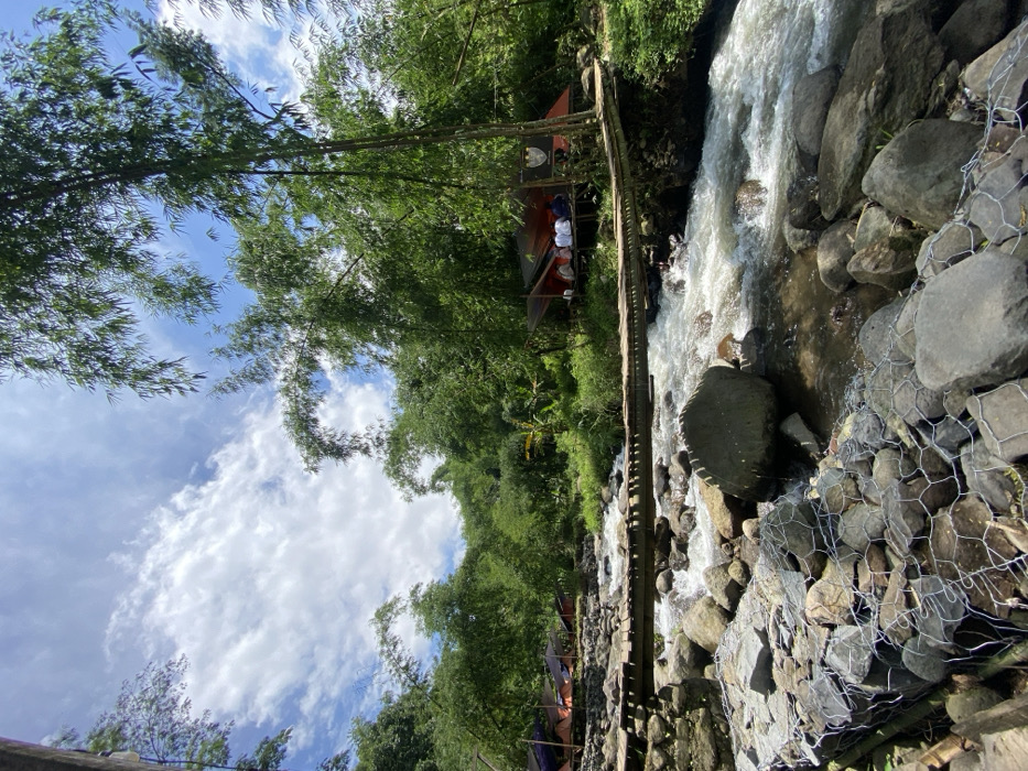 A stream of water rushes over rocks, bordered by a rock retaining wall encased in wire mesh. A rickety wooden bridge spans the stream, leading to a canopy structure. Lush green trees and bamboo stalks frame the scene, reaching towards a blue sky dotted with fluffy white clouds. The image is taken from a low angle, emphasizing the height of the trees and the flow of the water.
