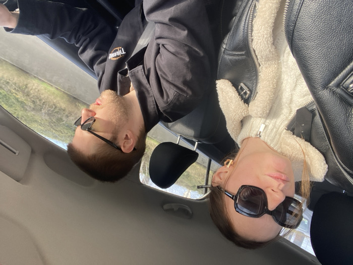 A forensic description of the scene reveals two individuals inside a moving vehicle, located in the city of Lille, France, during daylight hours. **People:** 1. **Passenger:** A female subject is seated in the front passenger seat. She possesses brown hair, partially visible, and wears oversized, rectangular black-framed sunglasses. Her lips are slightly pursed, and she wears gold-toned hoop earrings. She is dressed in a white, high-collared, possibly cable-knit sweater with a zipper closure, overlaid with a black leather jacket featuring a prominent cream-colored fleece or shearling collar and lining. Her body is oriented slightly right, away from the camera, and she appears to be looking forward and to the right through the windshield. 2. **Driver:** A male subject occupies the driver's seat. He has short, light brown hair and facial stubble. He wears dark-framed sunglasses with a subtle yellow tint to the lenses. His attire includes a dark-colored, possibly black, work-style jacket or shirt, on which a yellow-orange logo, partially legible as "THRASH__" (likely Thrasher), is visible on the left chest. He is secured by a seatbelt across his chest. His head is angled downwards and to the right, suggesting focus on driving or an object within the vehicle. **Vehicle Interior:** The vehicle's interior is visible, including dark headrests for both front seats and a light-colored headliner. Parts of the dashboard or door panel are dark-colored. **Environment:** The exterior environment, viewed through the windows, indicates a bright, sunny day. Green vegetation, consistent with an embankment alongside a road or highway, is visible. The vehicle appears to be in motion.