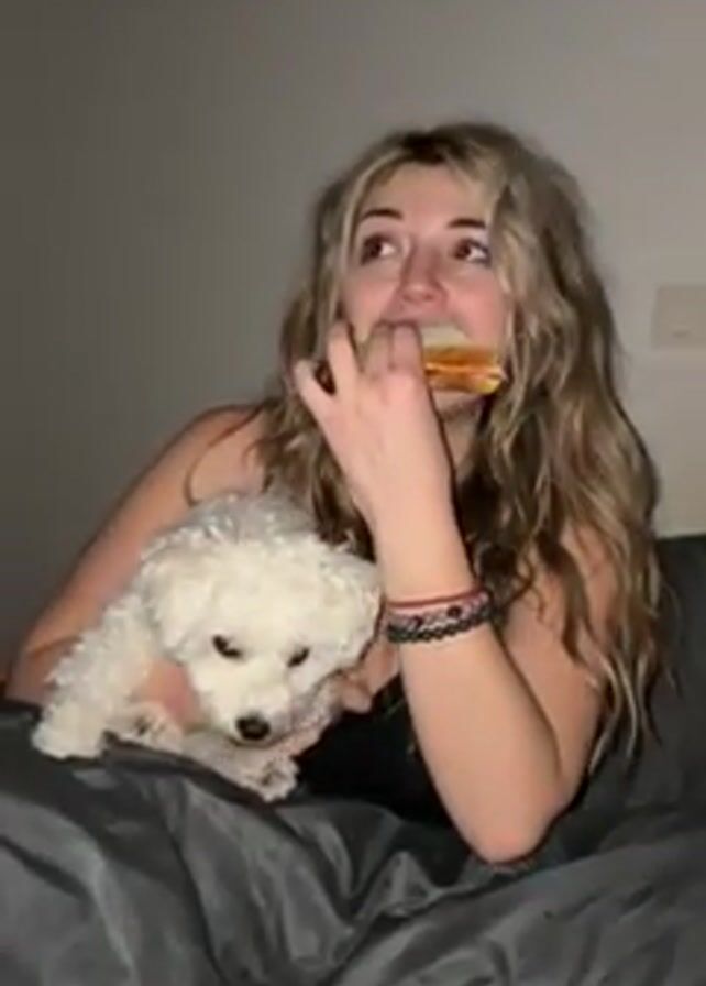 A young woman is sitting in bed, wearing a black tank top, with her long blonde, wavy hair down around her shoulders. She has several bracelets on her left wrist. She is holding a small, white, curly-haired dog in her left arm. The dog looks small and cuddly. In her right hand, she is holding a sandwich, and she is taking a bite. She looks up with her mouth open in a surprised expression. The bed has gray sheets and there is a small, white plate near her. The background is a plain, light-colored wall with a light switch.