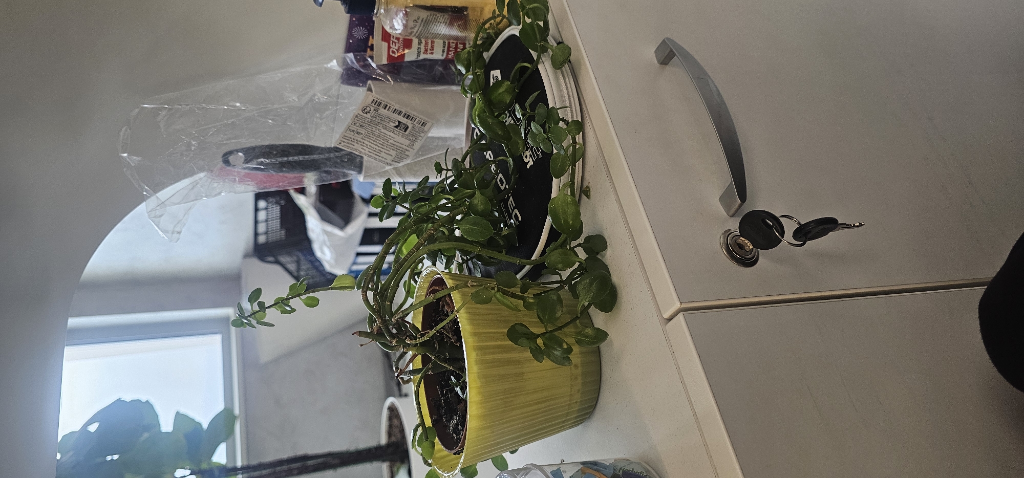 An indoor scene in Krivina, Bulgaria, depicts a cluttered surface illuminated by natural light from a window in the background. In the foreground, a light grey cabinet or drawer features a silver-toned handle and a circular lock mechanism, into which a ring of two dark keys is inserted. On the white countertop above, a prominent yellow, vertically ribbed plastic pot contains a green, leafy plant with numerous stems and small, rounded leaves, many of which spill over the pot's edge and onto a black, rounded object, possibly a padded case, to its right. To the left of the pot, a portion of a clear plastic jar is visible. The mid-background reveals a collection of items, including a large, crumpled clear plastic bag, a white cylindrical container with a label (partially obscured), a pump-action bottle labeled "DER" and "HAND SANITIZER," and a smaller packaged item. Further back, a window shows an undifferentiated bright sky. To the far left, a blurred portion of a larger plant stem in a white pot is visible, silhouetted against the light. No individuals or direct actions are depicted.