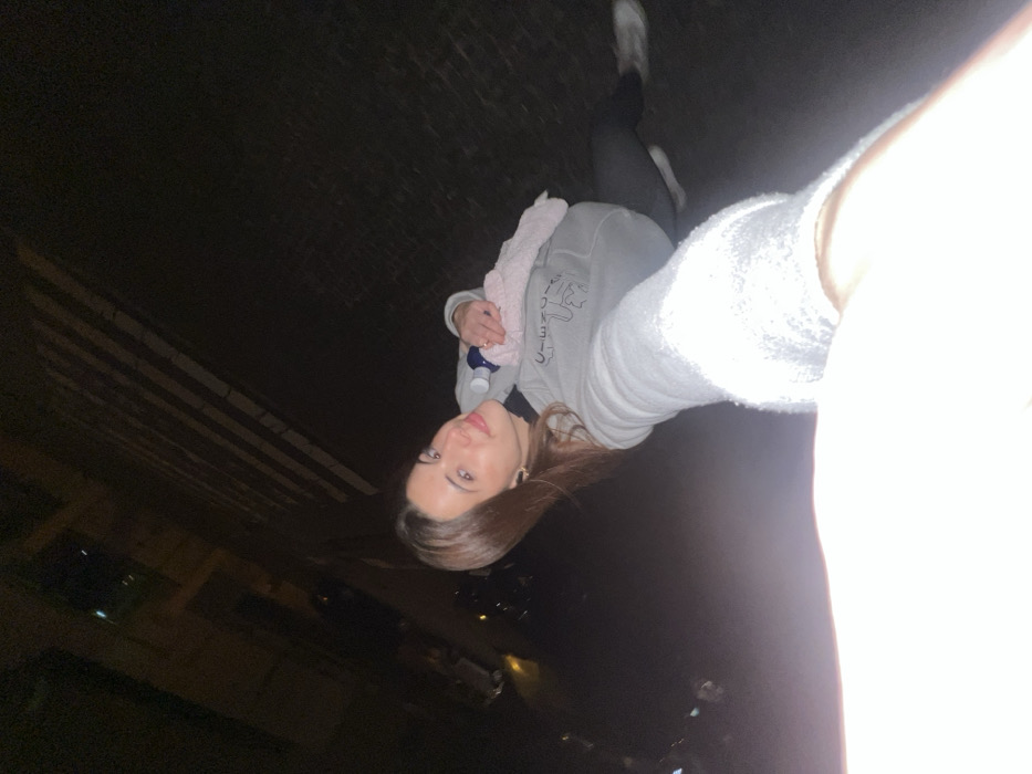A young woman stands outdoors at night, holding the camera in a selfie. She wears a light gray hooded sweatshirt with graphic designs, dark leggings, and white sneakers. She also has a pink plush item slung over her shoulder. The background shows a dark street with a building on the left and distant streetlights or car headlights visible in the center. The image is heavily lit by the flash from the camera, especially on the right side.