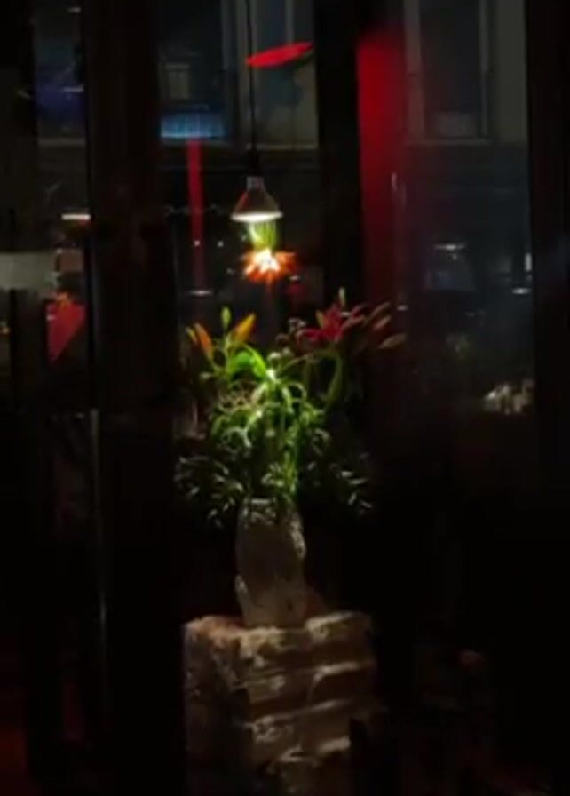 dimly lit interior space, possibly a restaurant or bar, seen through a glass window. A display of flowers in a vase sits on a blocky, off-white base, illuminated by a single bare bulb suspended above. The flowers are a mix of greenery and colorful blooms, likely lilies. Reflected in the glass are lights and building details from the street outside. The overall atmosphere is dark, with red ambient lighting inside the space. Music plays audibly in the background.