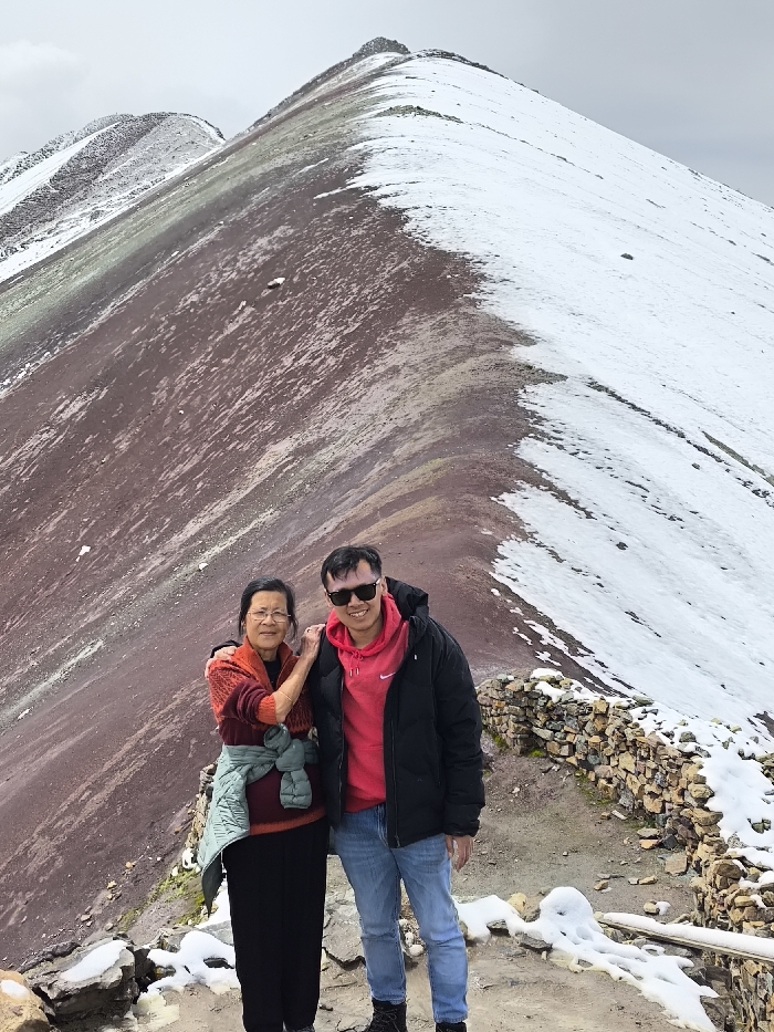 Two people stand on a mountain ledge overlooking a vast landscape. An older woman in a maroon sweater and black pants poses with a younger man in a red hooded sweatshirt, blue jeans, and a black jacket. The mountain ridge behind them is split between reddish-brown earth and snow-covered terrain. A stone wall runs along the edge of the platform. The sky is overcast, suggesting a high-altitude or mountain environment.