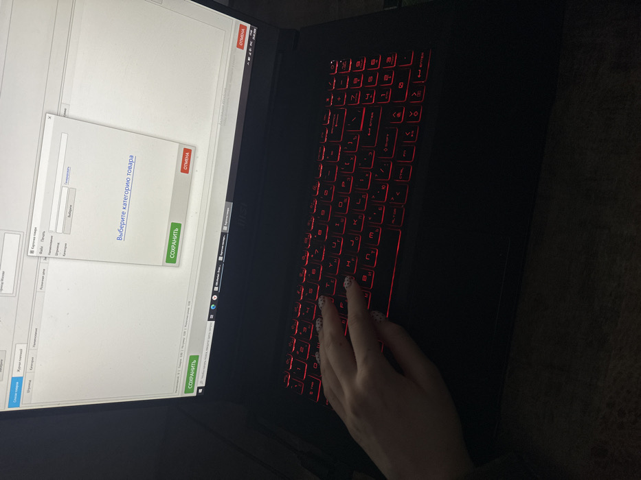An MSI laptop with a black chassis and a red-backlit Cyrillic QWERTY keyboard is displayed in a dimly lit indoor environment in Chaikovsky, Russia. A person's left hand, featuring fingernails with a white base and small black polka dots, is positioned above the keyboard, with fingers resting near the 'Ы' (S) and 'В' (D) keys. The laptop screen exhibits a Russian-language software interface, primarily displaying a "Карточка товара" (Product Card) application. An active modal window titled "Карточка товара" (Product Card) prompts the user to "Выберите категорию товара" (Select product category) and presents green "СОХРАНИТЬ" (SAVE) and red "ОТМЕНА" (CANCEL) buttons. The bottom right corner of the screen indicates the date "20.02.2020" and time "11:59." The laptop rests on an indeterminate dark, textured surface. The specific sub-location within Chaikovsky, Russia, is not discernible from the visual evidence.