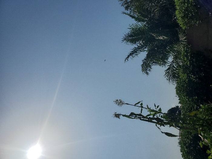 The image captures an outdoor scene in Akwanga, Nigeria, under a bright, clear sky. The sun is visible in the upper-left quadrant, emitting a distinct lens flare that extends diagonally across the sky. The sky itself is a light, uniform blue. A small, dark, irregular object, possibly an insect or bird, is discernible in the upper-right portion of the sky. The lower third of the frame consists of dense green vegetation. On the left, two tall, slender plants with prominent elongated seed heads are silhouetted against the sky. To their right and extending across the mid-ground is a mass of dark green foliage, consistent with dense shrubbery or a hedge. Partially visible above this foliage on the right are the fronds of a palm tree. No human subjects, animals, or man-made structures are clearly visible, apart from obscured elements within the dense foliage that suggest a boundary or wall.