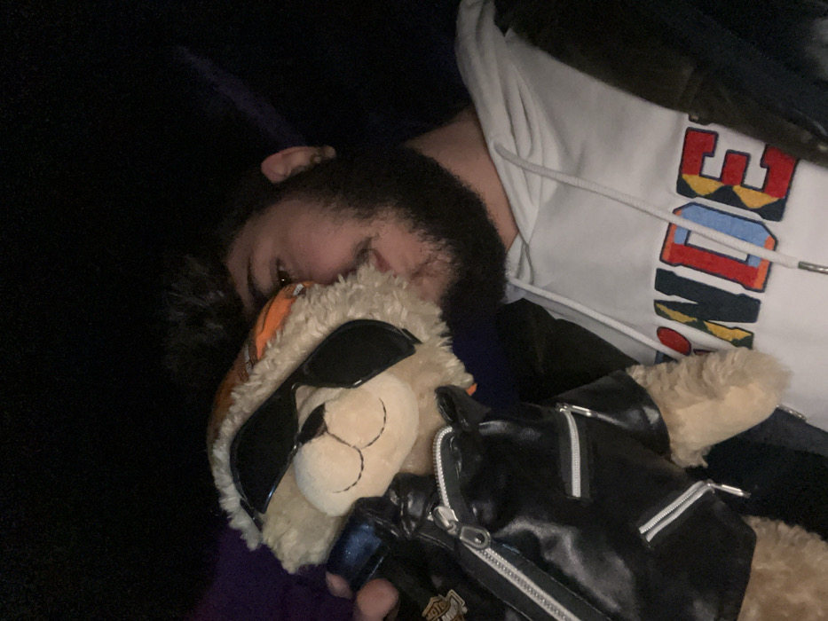A person with dark hair and a beard is lying down, appearing to be resting. They are wearing a white hoodie with colorful letters on the front. Cradled close is a stuffed teddy bear dressed in a black leather jacket and sunglasses. The scene appears to be dimly lit, and the person seems relaxed.