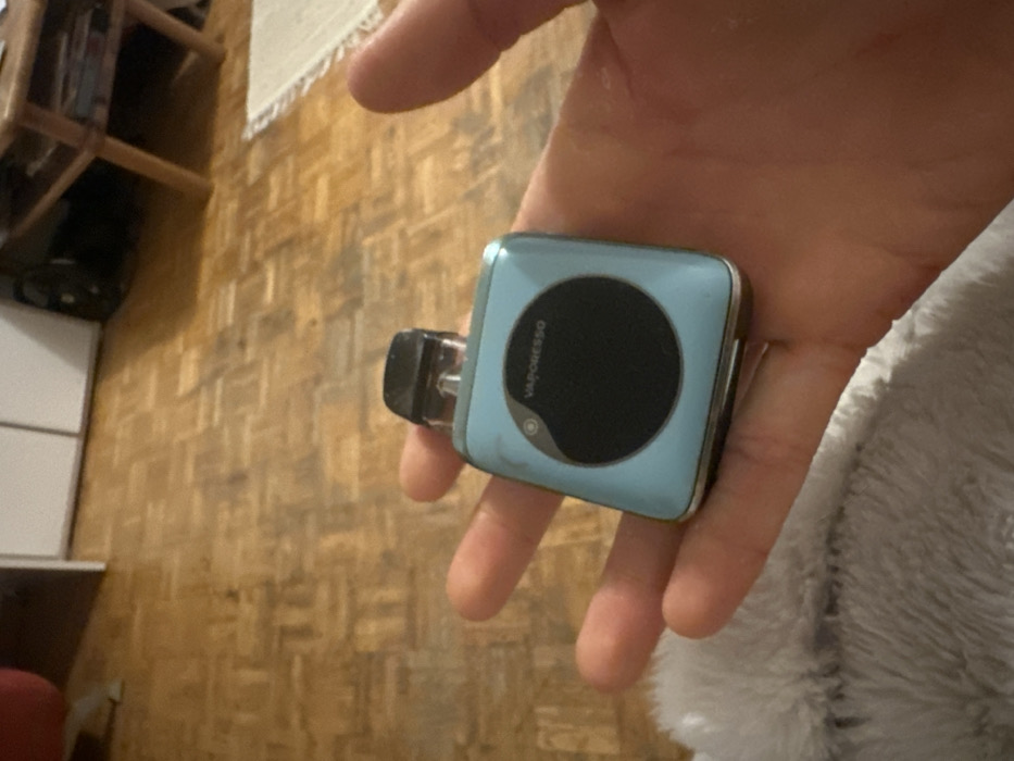 A human hand holds a light blue Vaporesso branded vaping device indoors in Villaz, Switzerland. The square-shaped device, featuring a black circular display area and "VAPORESSO" text, exhibits minor scuffs on its light blue casing and metallic base. The hand is positioned above a light gray, textured, possibly furry, textile surface. The background reveals a wooden parquet floor with a herringbone pattern, extending towards blurred domestic furniture, including a light-colored rug or mat on the right, and a wooden table and a dark object on the left.