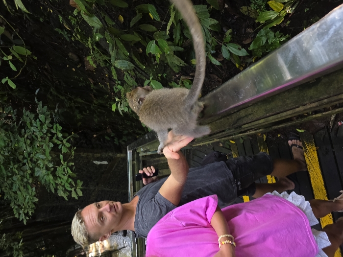 A monkey is perched on a metal railing, its tail curving upward. A person is holding their hand out to the monkey, and their other hand is holding what appears to be a small black camera. Another person is next to them, wearing a pink shirt. They are standing on a wooden boardwalk with yellow painted stripes. Lush green foliage fills the background.