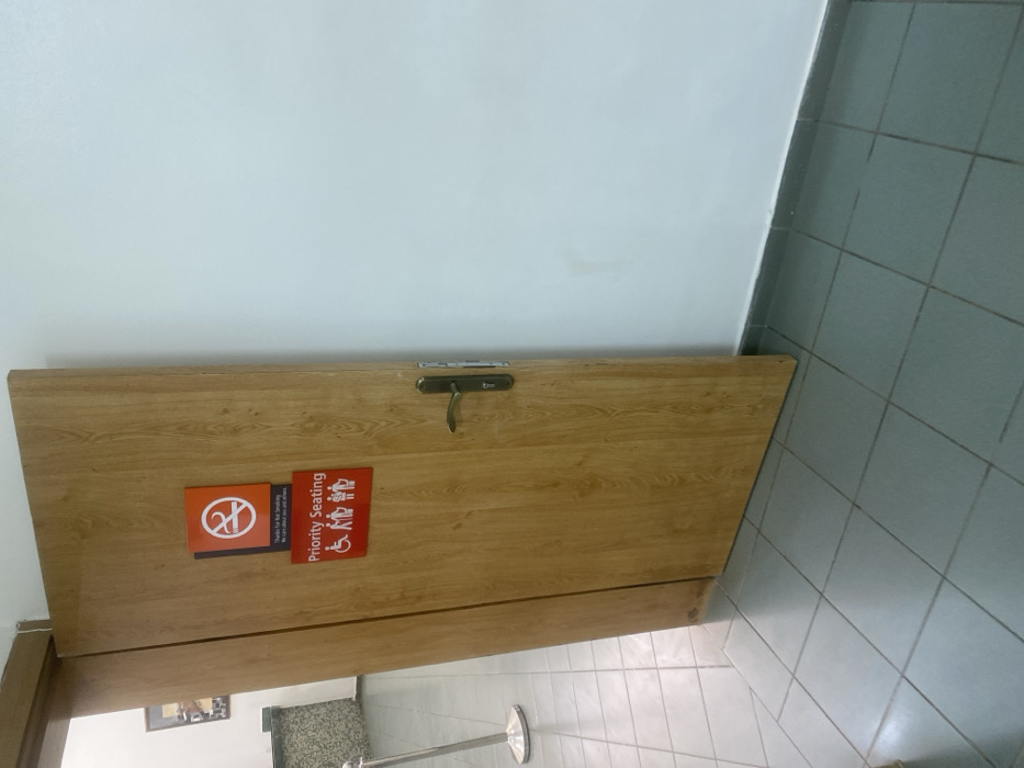 The scene depicts an indoor area within a building in Maiburiji, Nigeria. A light-colored wooden door, slightly ajar, is positioned centrally, opening inwards to the left. Affixed vertically to the door are two rectangular signs. The upper sign features an orange background with a white "No Smoking" symbol and the text "Thanks for not smoking. We care about you and others." Below it, a red sign displays "Priority Seating" along with white pictograms representing a person in a wheelchair, a pregnant person, a person with a child, and an elderly person. The door is equipped with a metallic lever handle. To the right of the door is a plain white wall with a dark green skirting board at its base. The floor throughout the visible area is covered in large square grey tiles with dark grout. Through the partially open door, a glimpse of another interior space is visible, showing a silver stanchion on the left and a dark counter or desk with a framed object in the background. No individuals are present.