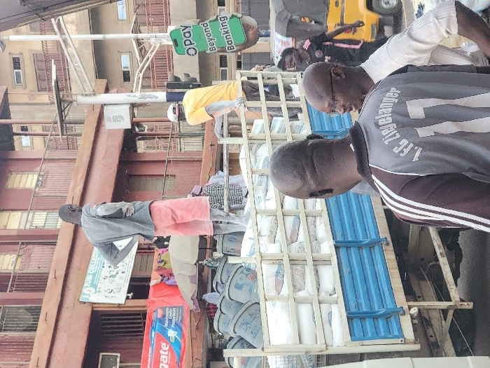 The image presents an urban street scene in Maiburiji, Nigeria, dominated by a light-colored truck with blue side panels, heavily laden with numerous white sacks and several grey buckets