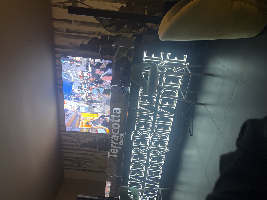 The image displays an interior setting. A television screen shows a crowded street scene, partially obscured by a sign reading "Terracotta Beach." Below the sign, a neon light displays the word "BELVEDERE" multiple times. A grey chair stands between the signs, and part of a tan-colored chair is visible in the top right corner. The floor appears to be made of large, dark tiles. The overall lighting is dim.