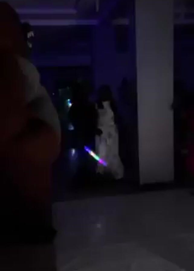 person in a large, hairy, red costume, possibly a gorilla or monster, walking through a room that appears to be set up for a party or reception. The room has a tiled floor and there are other people present, some standing around and others walking. There's also a table with glasses arranged on it. The lighting in the room varies from dim to brighter, possibly due to lighting effects or cameras. The video quality is inconsistent with the image often being blurry or distorted. The person in the costume seems to be moving with a deliberate gait.