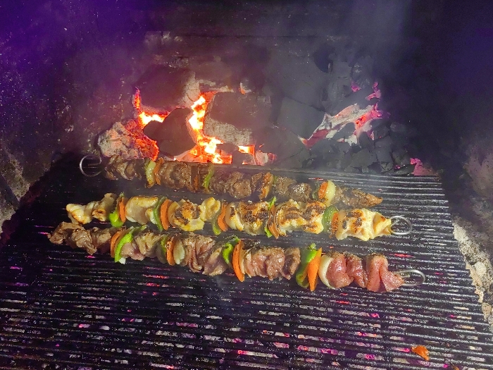 - "The scene depicts three metal skewers laden with various meats and vegetables actively grilling over hot charcoal embers within an enclosed, soot-stained stone or brick fireplace structure, located in Dobrinishte, Bulgaria" by FM-bS7EF2, licensed under CC BY 4.0