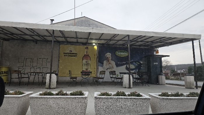 An exterior scene depicts a concrete building facade and an attached canopy, presumably in Rakitnitsa, Bulgaria, under an overcast sky
