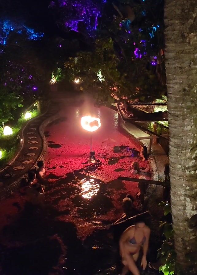 nighttime scene with people in a hot spring or pool, which is illuminated with red light and scattered with red petals or similar material
