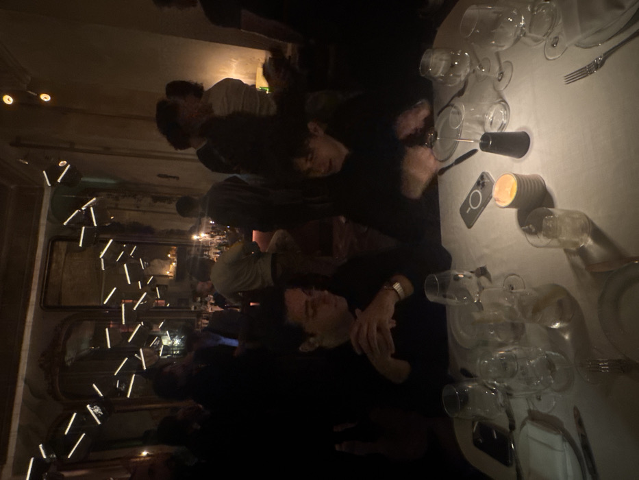 A dimly lit restaurant scene with a group of people seated around a table. The table is set with numerous wine glasses, plates, and cutlery. A phone and a can, possibly a candle holder, are placed on the table. Some individuals appear to be engaged in conversation, while others are looking down. The background features decorative mirrors with light fixtures. Overall, the atmosphere is relaxed and intimate, typical of a dining setting.