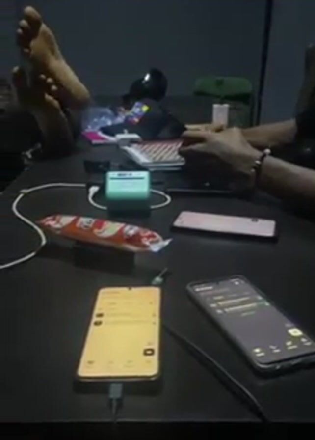 dimly lit room with a black table at the center. The table is cluttered with various items, including three smartphones, a laptop, a portable printer, a bag of chips, and other accessories. There are two people present. One person is lying back in a chair with their bare feet visible on the table. The other person is sitting upright and appears to be using a phone or working on something. The camera pans to the left to show more of the table, including a water bottle, a small globe, a pair of earbuds, and other miscellaneous items. The walls are gray and there is a picture or frame hanging on one of them.