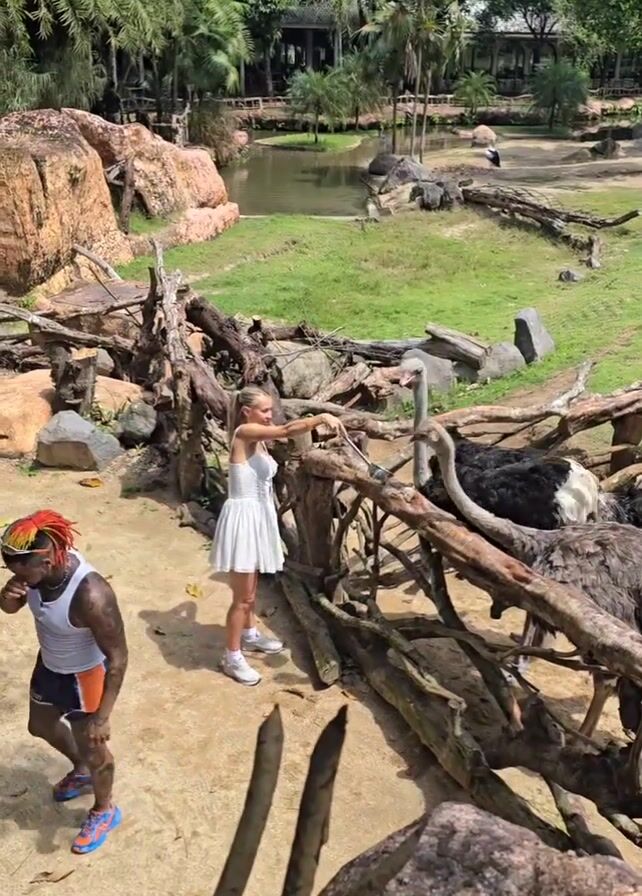 The scene is set at what appears to be a zoo or animal park on a sunny day. A woman in a short white dress and white sneakers stands near a wooden enclosure, interacting with a group of ostriches. She is holding a long, silver object, possibly a feeding tool, and appears to be attempting to feed the birds. A man with brightly colored hair stands nearby, wearing a white tank top and athletic shorts, observing the woman and the ostriches. The enclosure is surrounded by sand, rocks, and scattered tree branches. In the background, a pond or small lake is visible, surrounded by green grass, trees, and a building structure. The overall atmosphere is bright and natural.