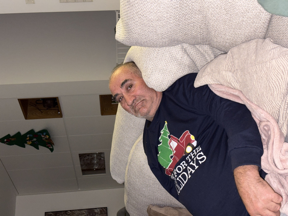 A man reclines on a light-colored couch amidst several plush cushions. He is wearing a navy blue long-sleeved shirt adorned with a Christmas tree and a vintage red truck, with the words "Joy for the Holidays" written on it. A soft pink blanket partially covers him. In the background, the ceiling is visible, featuring recessed lighting and a decorative Christmas tree cutout.