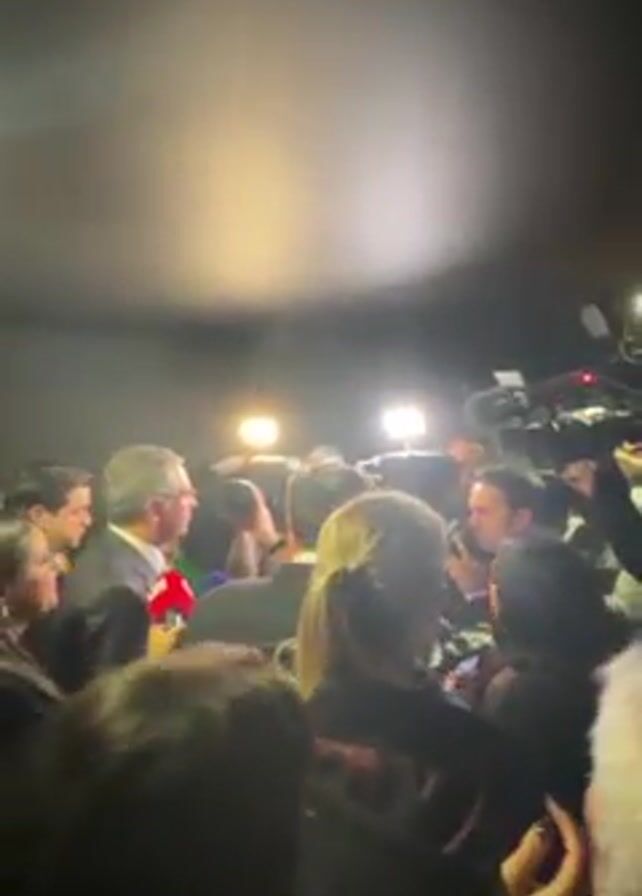 crowd of people in what appears to be a dark, enclosed space, possibly a hallway or a room. Several bright lights illuminate the scene. A man in a suit is the focus of attention, surrounded by people holding microphones and cameras, who seem to be interviewing him. Other individuals stand around, watching or trying to get a glimpse of the interaction. The atmosphere is crowded and filled with activity, indicating a press event or a public appearance of some sort.