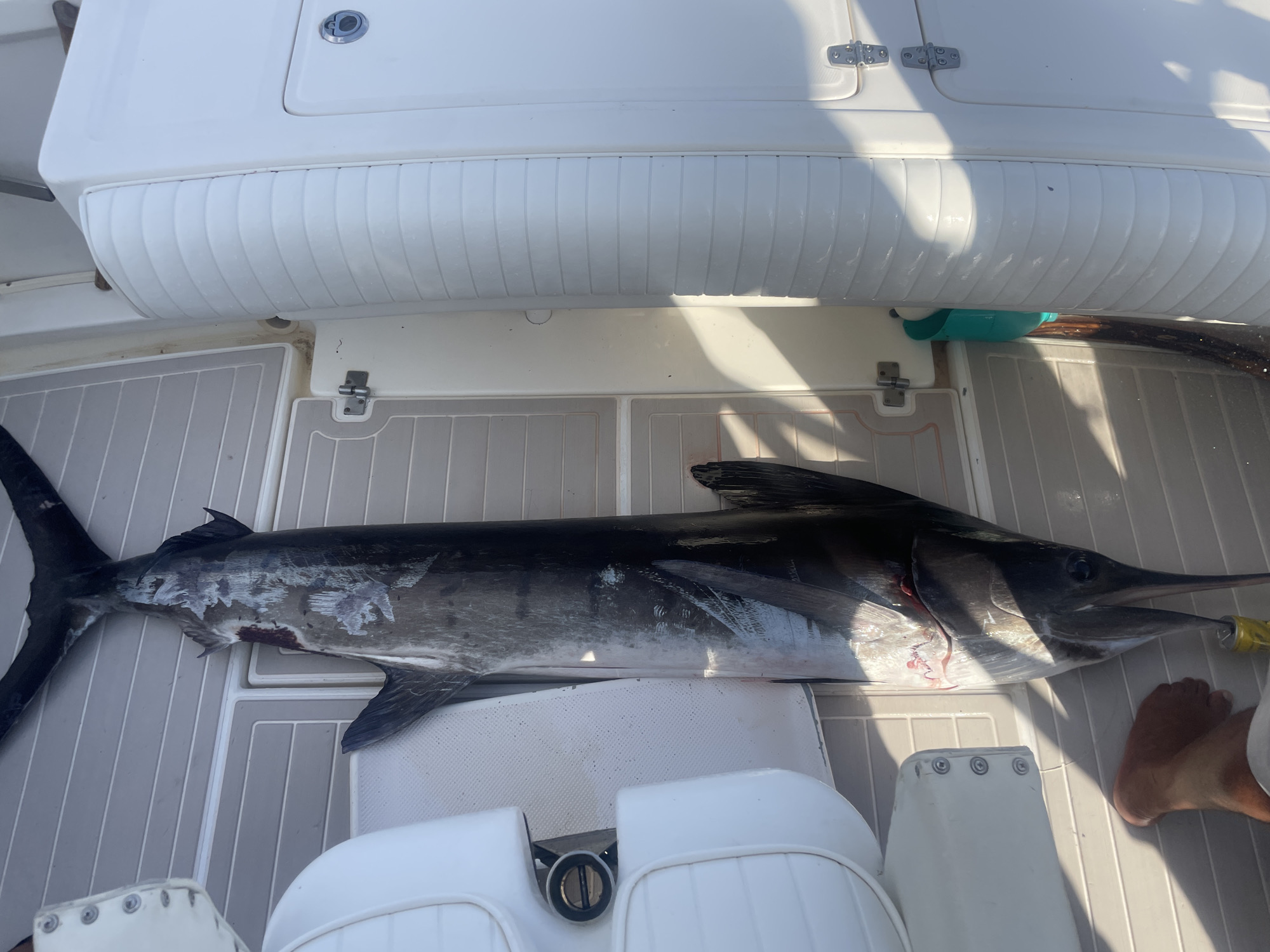 A dead swordfish lies on the deck of a boat. The swordfish is black and grey with a long, pointed bill. It is positioned horizontally on the grey and white boat deck. A white cushioned bench seat and the boat’s white interior frame the fish. Part of a bare foot is visible near the head of the fish. The location, Cabo Pulmo, Mexico, cannot be verified from the image.