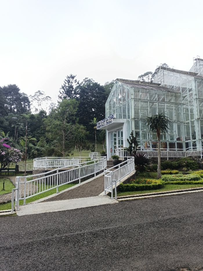 Located in Kadoma, Zimbabwe, the scene depicts a large, multi-sectioned glass greenhouse building under an overcast sky. The structure features a prominent white entrance section with a gabled roof, above which signage reads "PUSAT KONSERVASI TUMBUHAN KEBUN RAYA BOGOR". The majority of the building is constructed from glass panels supported by a light-colored framework, reflecting the surrounding environment. A paved, segmented ramp system with white metal railings provides access to the building's entrance from the foreground, where a dark asphalt surface is visible. To the right of the entrance, a cultivated garden area displays manicured green hedges, smaller shrubs, and beds of orange and pink/purple flowering plants. A tall, palm-like plant stands near the building's right side. To the left of the ramp, a winding paved path traverses grassy areas, bordered by a variety of green trees and bushes, including some with vibrant pink-purple blossoms. A dense, verdant forest forms the background, encompassing tall trees that rise above the greenhouse. No human figures or discernible actions are present within the frame.