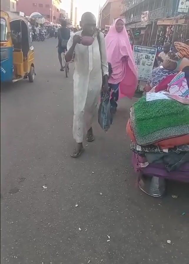 man dressed in a white traditional robe walking down a busy street while drinking from a pink cup. He carries a dark shopping bag in his other hand. Beside him is a woman wearing a pink hijab. In the background, there are buildings, a small blue taxi, and people walking. To the right, there is a display of goods including a green rug and other fabric items. The street is paved and looks slightly worn. The scene is a bustling market environment.