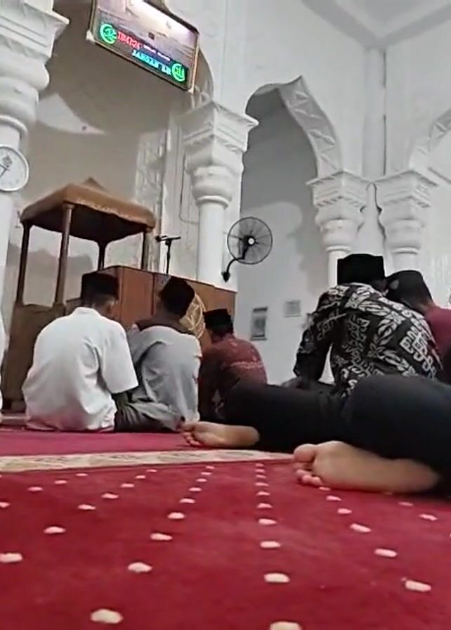 Several men are sitting on a red carpet in a mosque. Most of the men are wearing caps. The mosque is mostly white with columns and arches. There is a wooden pulpit with a star design on it, and a digital clock shows the time. A TV screen displays information in the corner. Some of the men are barefoot.