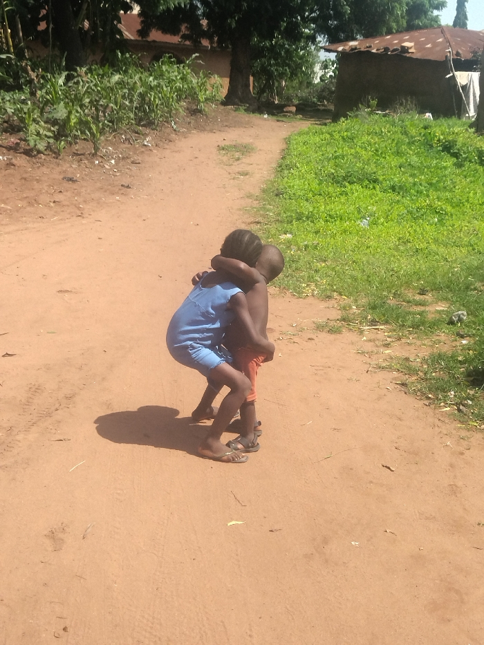 Two children stand on a dirt road, embracing. The child in the blue shirt is slightly bigger and appears to be giving a piggyback ride to the child in orange shorts. They are in a rural setting, with green foliage and small buildings visible in the background. The ground is a reddish-brown dirt. A shadow cast by the children emphasizes the sunny, outdoor environment.