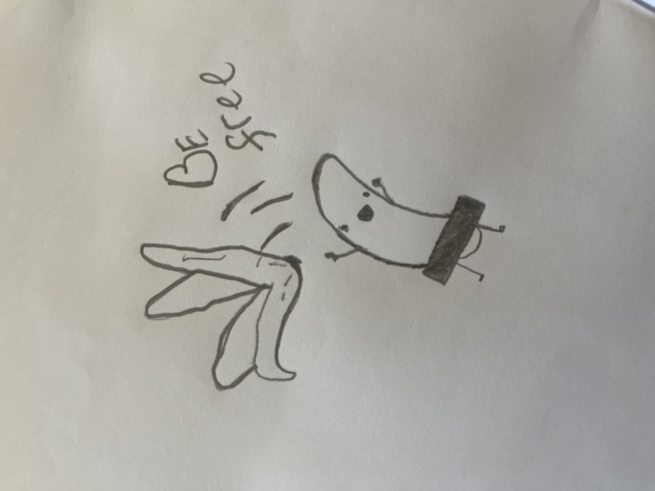 The image displays a hand-drawn cartoon executed in dark ink on a plain white background, likely a sheet of paper. The central figure is an anthropomorphic banana character with a simplified face consisting of two dark circular eyes and a small oval mouth. Its stick-figure arms are raised upwards, and stick-figure legs are visible below. A solid dark grey rectangular bar is drawn horizontally across the banana's midsection, obscuring part of its body. Positioned above and to the left of the banana character is a partially peeled banana skin, from which the character appears to be detaching or emerging. Several short, dark lines are drawn between the banana character and the peel, suggesting movement or separation. To the upper right of these figures, the phrase "BE free" is handwritten in dark ink, with "BE" in uppercase letters and "free" in lowercase. The drawing exhibits consistent line weight. This depiction is a static illustration and does not contain discernible environmental details or a specific physical location within the city of Pazardzhik, Bulgaria.