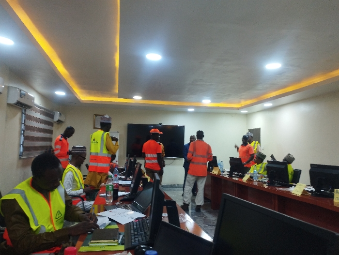 meeting room in an office building located at latitude 10.929 and longitude 11.476 in Ashaka, Nigeria. There are eight men in the room, all wearing yellow vests and some wearing orange shirts. The men are seated at a long wooden table with laptops, keyboards, monitors, and other office supplies. The room has a white ceiling with recessed lighting, a large flat-screen TV on the wall, and beige walls. Some men are engaged in conversation, while others are working on laptops or talking on their phones. The man in the foreground appears to be writing on a notepad while looking down. The scene suggests a training session or work-related meeting taking place.