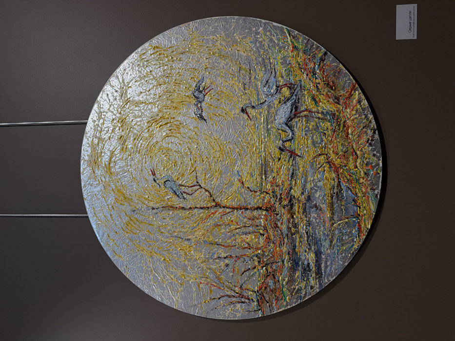 An art exhibition in Irkutsk, Russia, displays a circular mixed-media painting titled "Grey Herons" (Серые цапли)