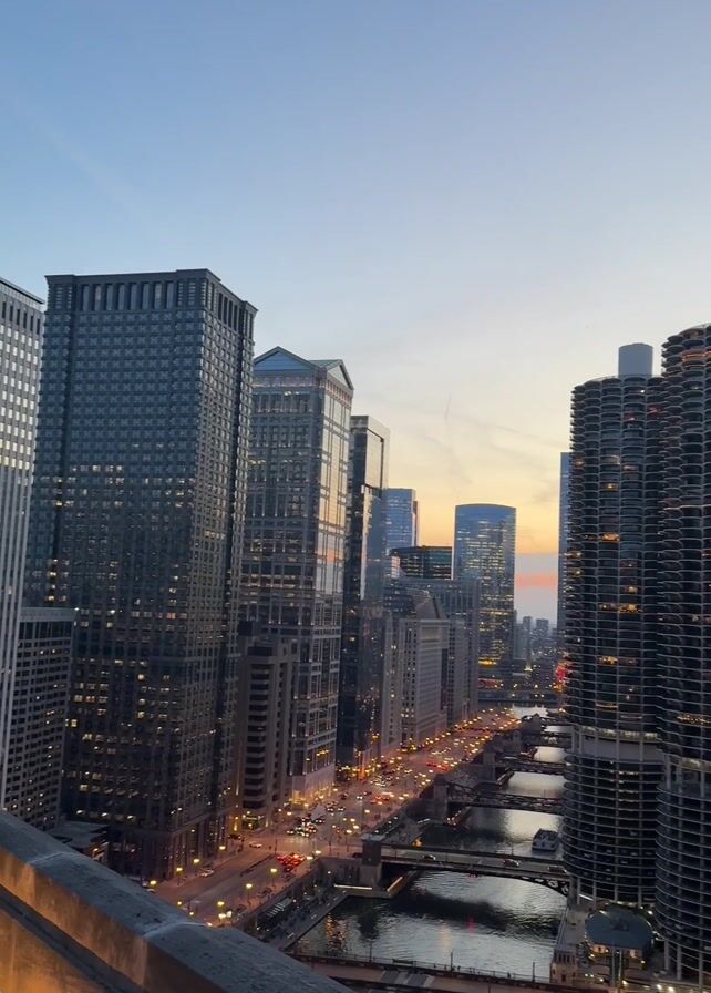 The video displays an evening cityscape in Chicago with numerous skyscrapers, a river, and bridges