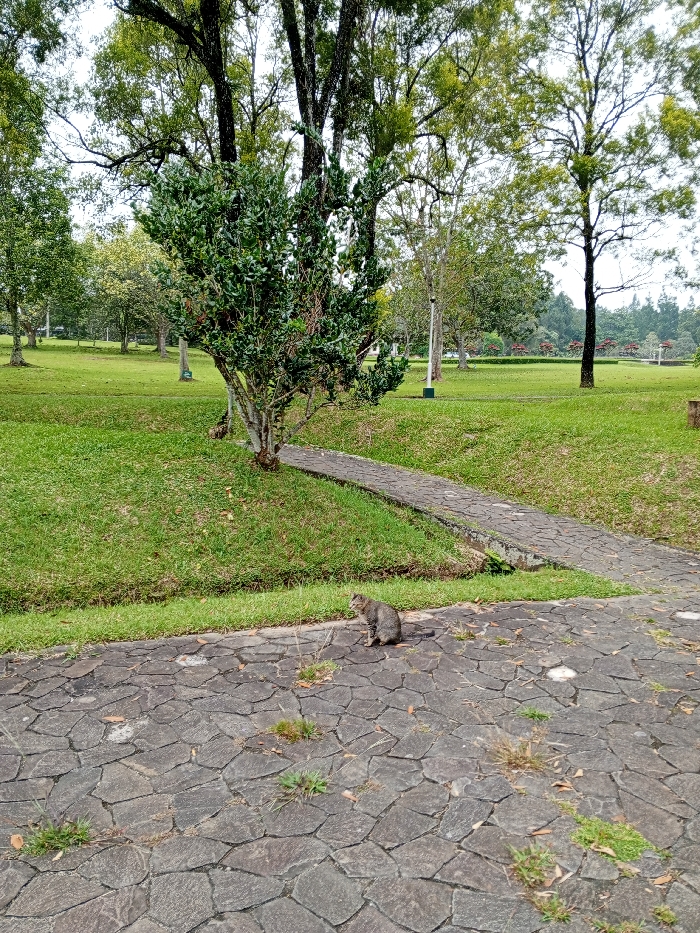 A tabby cat sits on a stone-paved area next to a strip of green grass. Behind the grass, a stone pathway crosses over a shallow ditch, leading towards a large green lawn dotted with various trees and shrubs. The sky is overcast, providing soft, diffused lighting across the scene. The overall impression is one of peaceful tranquility in a park-like setting.