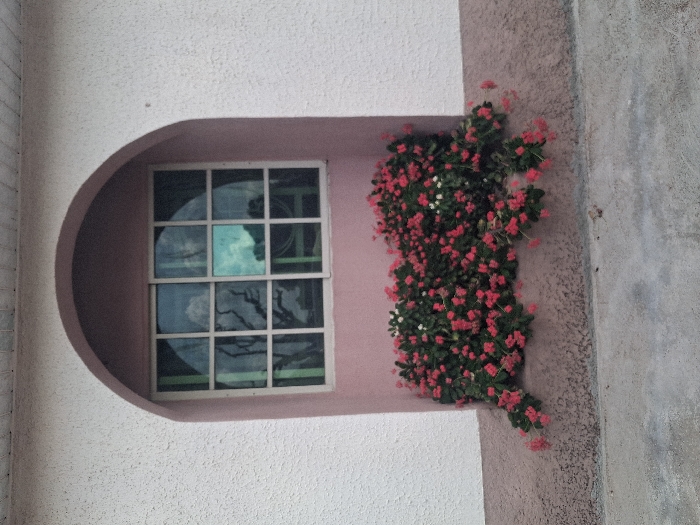 This image depicts an exterior view of a building in Wukari, Nigeria, focusing on a window recess. The building wall, visible on the left and top right, is textured and painted a light, off-white or very pale beige color. An arched recess is centrally positioned, painted a muted pink or mauve. Within this recess, a rectangular window is installed, featuring white frames that divide it into eight panes (two across, four down). The window glass reflects an outdoor scene, including what appears to be a light sky and dark, bare tree branches. Directly beneath the window, within the lower part of the arched recess, is a flower bed. This bed contains numerous plants with dense green foliage and an abundance of small, bright reddish-pink flowers, with a few scattered white flowers also present. These plants cascade slightly over the edge of a textured, darker brown or mauve-colored ledge that forms the base of the recess. The ground directly in front of the building is a plain, light grey concrete or paved surface. No individuals or active elements are present in the scene. The lighting suggests daylight conditions, possibly overcast.
