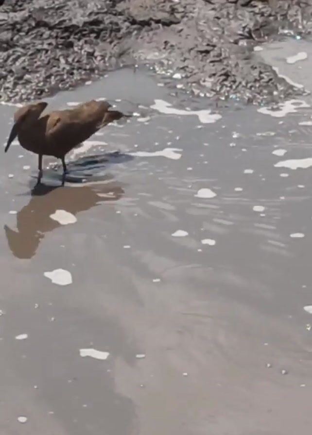A brown bird stands in a muddy, shallow body of water, its reflection visible in the still surface. The water is gray and slightly frothy. To the side is a muddy bank, covered in rough terrain. The bird dips its beak in the water, seemingly foraging. The footage is captured from a medium distance. There are audible voices in the background.