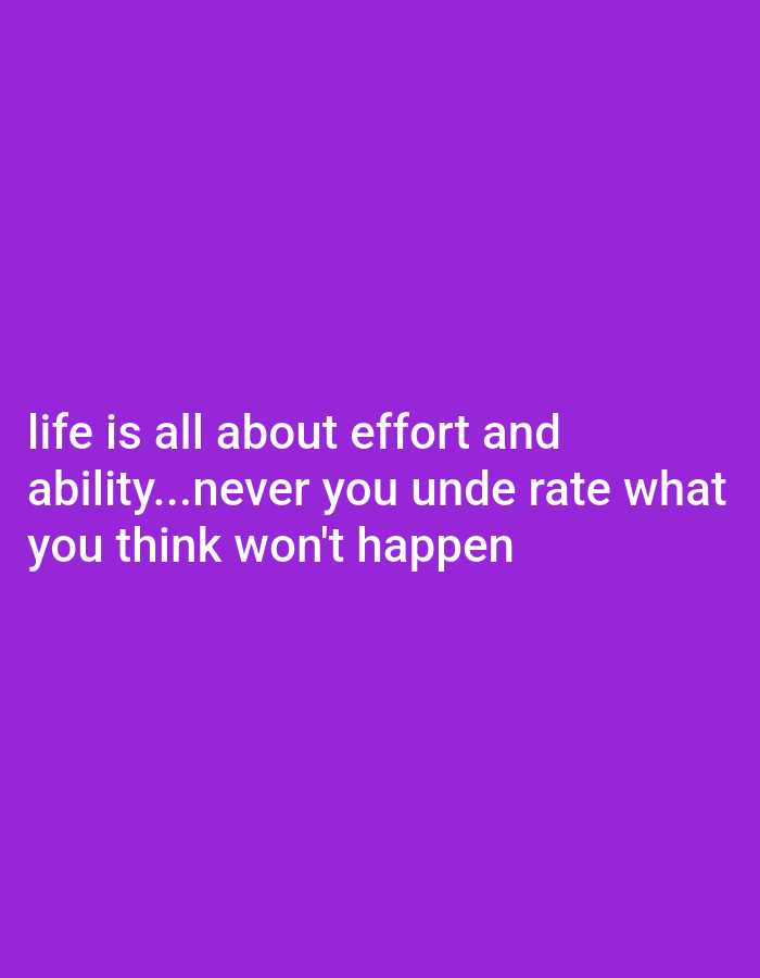 A motivational message appears on a solid purple background. The white text states, "life is all about effort and ability...never you unde rate what you think won't happen." The phrase encourages viewers to acknowledge the importance of effort and skill, and advises against underestimating the potential for unexpected outcomes. The simplified design puts emphasis on the empowering message.