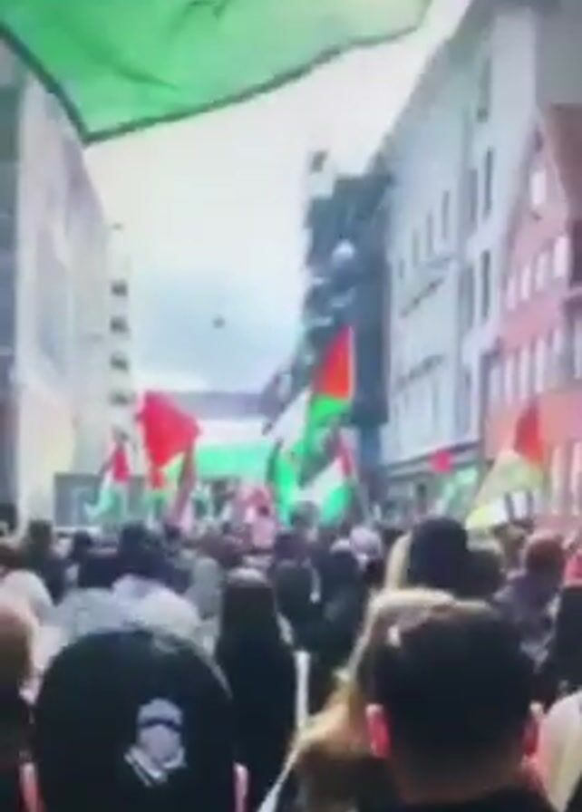 crowd of people gathered on a city street, many waving Palestinian flags. The buildings on either side of the street are typical European architecture. The sky is overcast. The crowd appears to be moving forward, possibly in a march or demonstration. The focus is on the backs of the heads of the people in the foreground and the flags being waved in the distance.