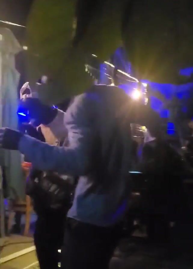 dimly lit outdoor venue at night with people gathered, presumably at a party or event. There are several figures, including one in a white shirt and another in a blue shirt. There's a stage setup with what appears to be musical instruments, and colored lights are illuminating the scene. The camera angle is low, and the footage is shaky, suggesting it was taken by someone in the crowd.