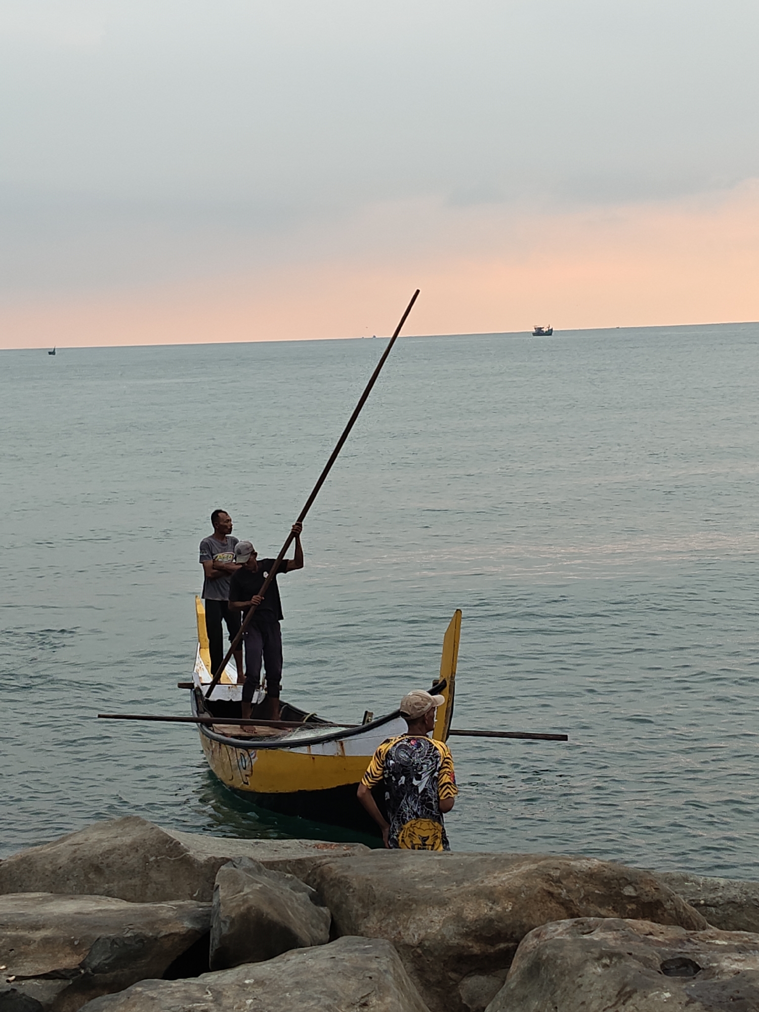 The image captures a coastal scene in Lhokseumawe, Indonesia, likely during sunrise or sunset, indicated by the orange gradient on the horizon under an overcast grey sky. A small, yellow and black wooden fishing boat with a high, pointed stern floats in calm, greenish-blue water. Three adult males are present in the boat. One man, wearing a grey t-shirt and dark pants, stands on the left side with his arms crossed. Another man, in a dark t-shirt and dark pants, stands barefoot in the boat's center, holding a long, dark pole vertically with both hands. A third man is partially visible toward the front of the boat. A fourth adult male, wearing a patterned yellow and black shirt and a light-colored baseball cap, stands on a formation of large grey rocks in the immediate foreground, facing the boat. The sea extends into the background, where faint silhouettes of other vessels are visible on the horizon. The scene depicts activity around the boat, suggesting preparation for departure, launching, or arrival at a rocky shore.