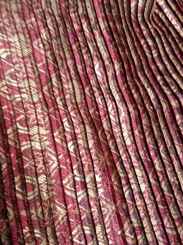The image displays a close-up of pleated fabric, primarily maroon and gold in color
