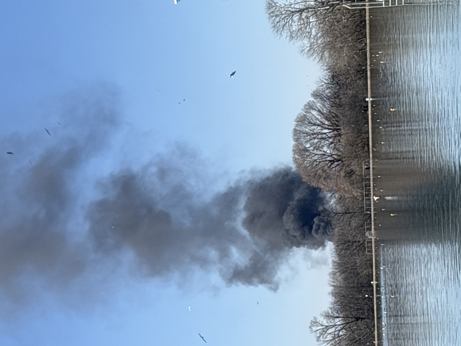 The image presents a wide view of the Rowing Canal in Plovdiv, Bulgaria, under a clear blue sky, featuring a prominent column of dense black smoke. The canal water occupies the lower two-thirds of the frame, appearing calm with a slight reflection of the sky and smoke. Numerous small, white, and a few scattered yellow buoyant objects are visible on the water's surface. Several birds are either floating on the water or in flight against the sky. A dense, bare treeline, characteristic of deciduous trees in late autumn or winter, forms the horizon, obscuring the exact source of the smoke plume. The black smoke rises vertically and expands significantly as it ascends into the atmosphere. No human subjects are discernible within the frame.