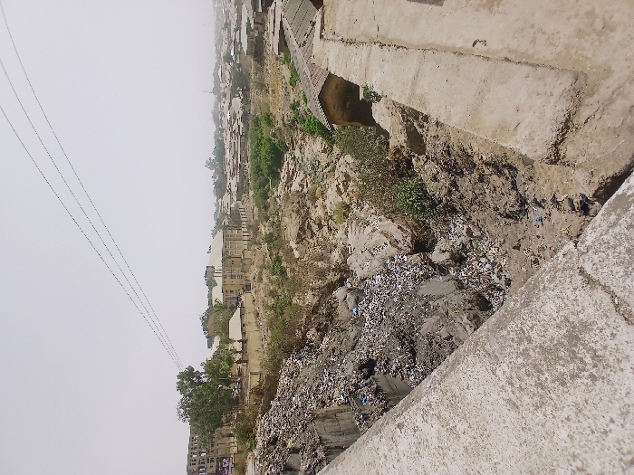 The image displays an elevated view of an urban environment in Kadoma, Zimbabwe. In the immediate foreground, a weathered concrete structure, consistent with a bridge railing, extends diagonally from the lower left. Below this structure, a significant gully or ravine is visible, its left slope heavily filled with accumulated solid waste, including plastics, paper, and various debris. The gully's lower sections consist of dry, irregular rock formations and earthen surfaces, interspersed with sparse vegetation. On the right side, another concrete structure, possibly a wall or pathway, descends towards the gully. A small, single-story building with a light-colored exterior and a brown, low-pitched roof is partially visible near the gully's edge on the far right. The midground and background depict an extensive urban landscape under a hazy, light-gray sky. Numerous buildings of varying sizes and architectural styles are present, predominantly multi-story structures with light-colored facades. Dry, sparse trees and bushes are scattered throughout the built environment and within the gully itself. Three parallel utility lines traverse the upper portion of the sky. No individuals or specific activities are observable within the scene. The environment appears dry and extensively developed.
