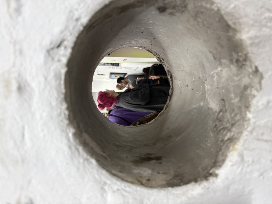 - "The image presents an indoor scene viewed through a circular, roughly textured aperture, approximately 30-40 cm in diameter, composed of a light grey, concrete-like material exhibiting some surface wear and darker smudges" by FM-mVYFp2, licensed under CC BY 4.0