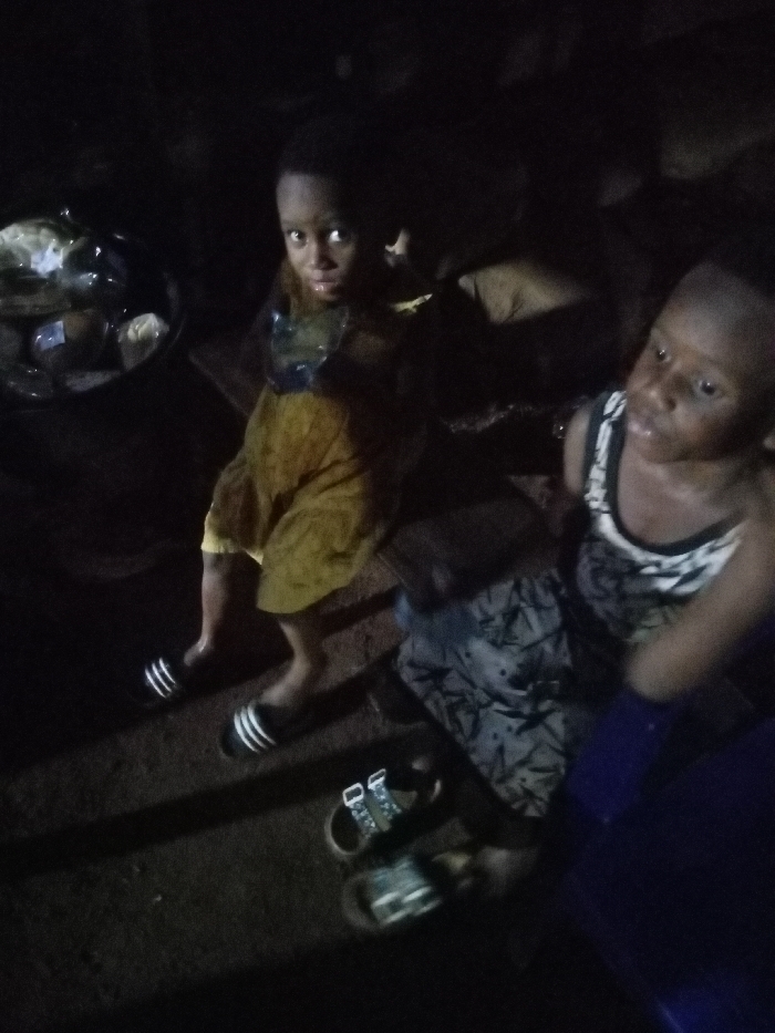 Two children sit in dim lighting. One child wears a yellow dress and black and white striped sandals, looking directly at the camera. The other child, beside them, has on a patterned gray and white top and is looking to the side. Sandals are on the ground next to the second child. In the background, there is a pot with food. The scene is dark, with only the children and the pot being dimly illuminated.
