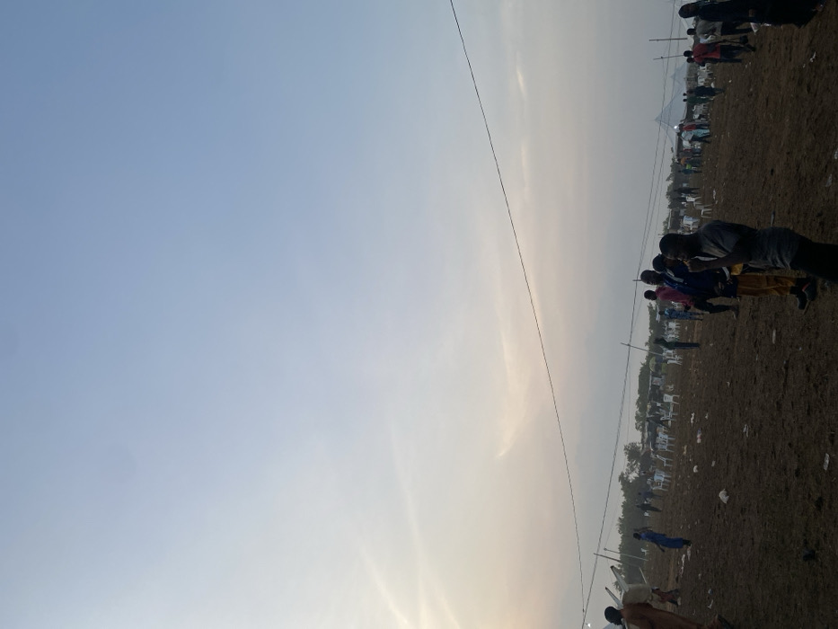 An outdoor gathering on a grassy field under a pale blue sky. A group of people stand in a row, with others scattered throughout the field. Many white plastic chairs are visible. There is what looks like a wire going across the top of the photo.